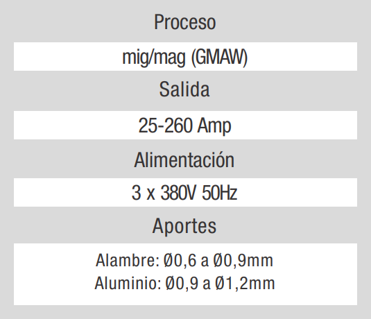 Este equipo Trifásico de 260 amp que se destaca por su excelente desempeño y alto rendimiento con alambre 0,9. Su diseño permite un arco estable y mínimas proyecciones casi toda ocasión, y un destacado desempeño con gas CO2.